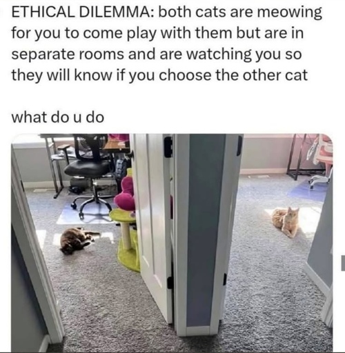 With my current cats I have a clear favourite so I would go to her, and then the other one would run in the room and demand the attention because he is a needy little shit. I love him though, he just never lets her (or anyone) have a moment of peace.