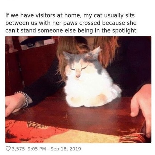 A picture of a person from the neck down sitting at a table, a cat is sitting on their lap with its paws curled and tucked. Text reads “If we have visitors at home, my cat usually sits between us with her paws crossed because she can’t stand someone else being in the spotlight.”