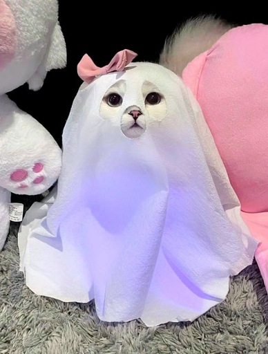 A picture of a cat wearing a white cloth ghost costume with cutouts for eyes and mouth. The top of the costume has a pink bow.