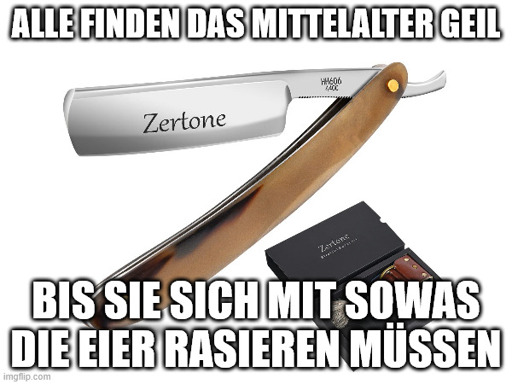 Im Mittelalter musste sich niemand die Eier rasieren. Ich habe sogar den Verdacht, dass sich damals überhaupt kaum jemand rasieren musste, wenn er nicht gerade ein Mönch mit Tonsur war, oder ein Adeliger der mit seinem Style auf Status machen muss, weil ihn sonst die Hofdamen nicht mögen.