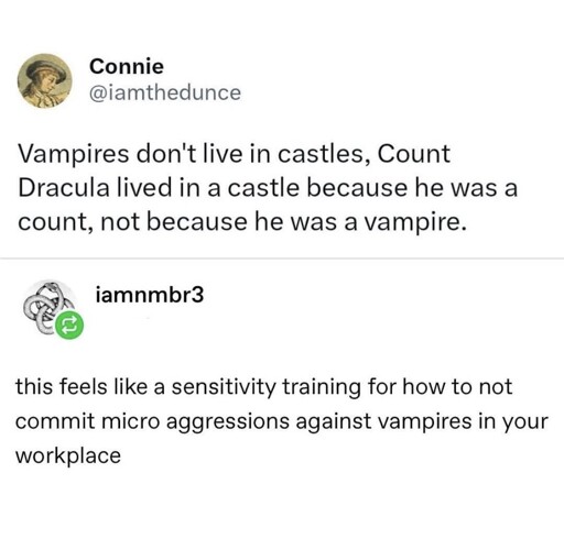 I’m pretty sure it was something like “Dracula doesn’t have a castle because he’s a vampire. He has a castle because he’s a Count.”