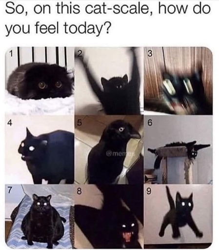 The caption reads “So, on this cat-scale, how do you feel today?”, attached is 9 pictures of black cats in various funny positions.