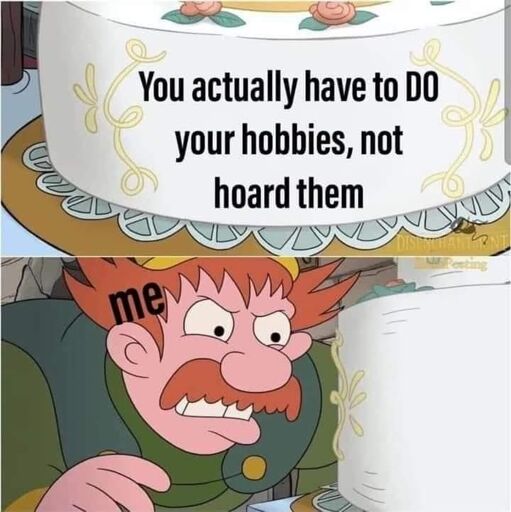 It fucking hurts when I finish a day, can’t muster the energy to start on one of my projects, then just sit there hating myself while I waste another day doing shit I don’t enjoy (scrolling memes) rather than doing something I do enjoy (ANY OF MY GOD DAMNED HOBBIES!)