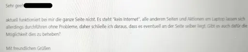 aktuell funktioniert bei mir die ganze Seite nicht. Es steht “kein Internet”, alle anderen Seiten und Aktionen am Laptop lassen sich allerdings durchführen ohne Probleme, daher schließe ich daraus, dass es eventuell an der Seite selber liegt. Gibt es auch dafür die Möglichkeit dies zu beheben?