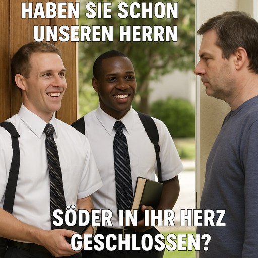 Das muss KI sein, wer lässt Haustür-Missionare denn soweit in die Wohnung? Die lässt man normalweise an der Gegensprechanlage abblitzen