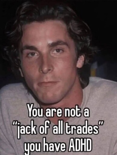 minus-squarePattyMcB@lemmy.worldlinkfedilinkEnglisharrow-up10·3 months agoBut that makes me a jack of all trades. ADHD is just the reason I go from one thing to the next