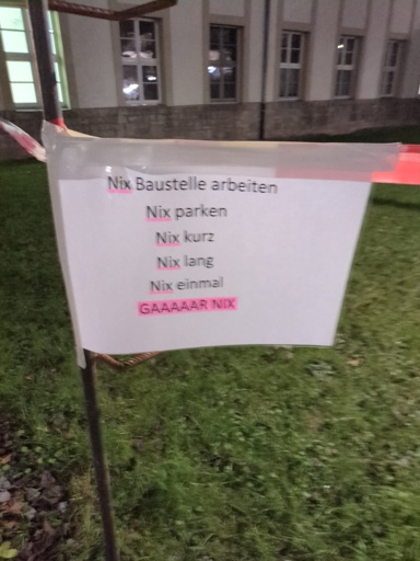 Gefühlt jedes mal, wenn ich an dieser Baustelle vorbeikomme, wird der Text aggressiver. Scheinbar bessert sich das.Problem nicht.