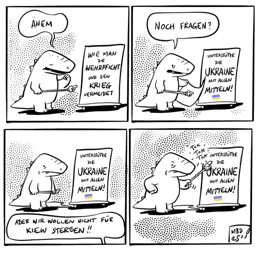 Es ist unglaublich, dass in der deutschen Politik die Unterstützung der Ukraine so unbeliebt ist. Die AfD, das sind hässliche Menschenfeinde, die Putin lieben. Die heutige CDU ist die AfD light. Die SPD steckt mit der einen Hälfte noch in Putins Arsch, mit der anderen läuft sie ziellos durch den Raum und schreit “Aaarghh!”. Die Ferengi sind komplett irrelevant geworden. Die Linke steckt bis zu den Knöcheln in Putins Arsch, blubbert dümmlich irgendwas von Pazifismus und wäre ansonsten leider die einzig wählbare Partei. Die Grünen sind die einzigen, die in der Hinsicht stabil sind, haben sich ansonsten aber in eine SPD ohne Arbeiter:innen Solidarität verwandelt.