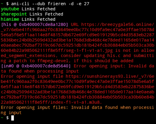pkg upgradeani-cli -UI see that ani-cli prefer to use yt-dlp to ffmpeg if it’s available so you could try installing that too.