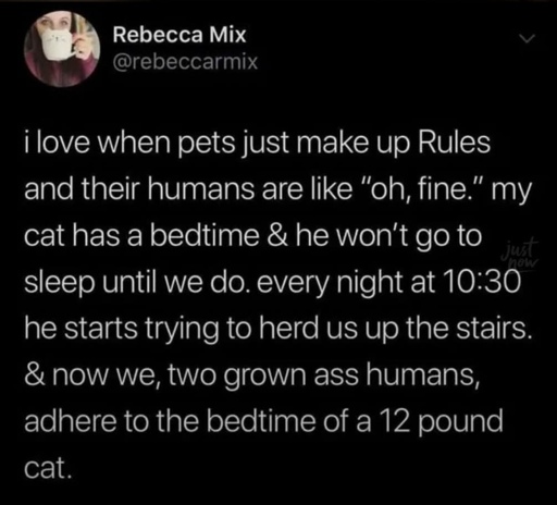 minus-squareDeathsEmbrace@lemmy.worldlinkfedilinkarrow-up76·3 days agoMy cat literally expects us to be awake at a certain time and will keep meowing us until we awake. I noticed if I don’t wake up my cat will make sure I do.