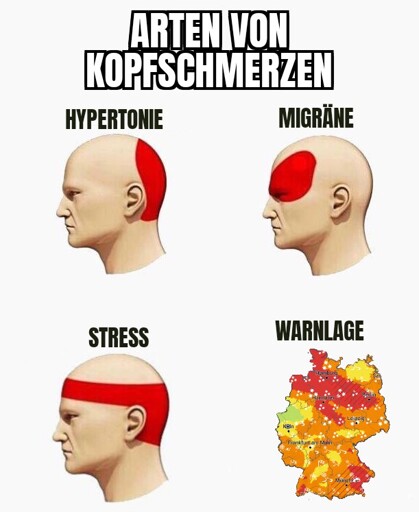 My German is lacking but I interpret this to be “types of headaches” followed by some kind of flood or natural disaster warning? Very clever I really like it.