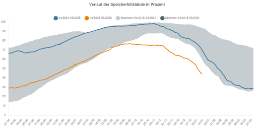 Der graue Bereich zeigt wo die Kurven die letzten Jahre so waren. Die orangene Linie ist der heutige Stand und klar drunter. Bei Habeck gab es damals einen Aufruf an die Bevölkerung Gas zu sparen. Reiche sieht wohl kein Problem.
