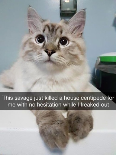 Years ago my cat was joyfully playing with a house centipede and my boyfriend at the time told me to look, she was doing something cute.