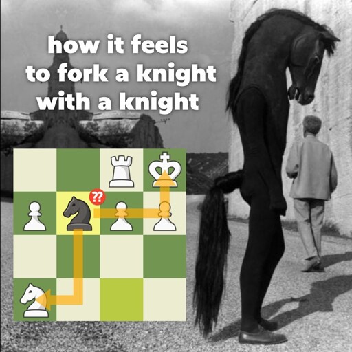 minus-squareSkullgrid@lemmy.worldlinkfedilinkarrow-up9·2 months agoThis knight is forking unbelieveable! It’s forking everything! The king, the queen, the rook , that knight… Wait…