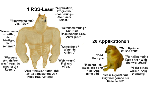 Euer Thunderbird kann übrigens seit zwanzig Jahren RSS feeds verwalten und (un-)ordentlich verschachteln, was ganz gut ist, da er eh schon einen HTML-renderer mitbringt.