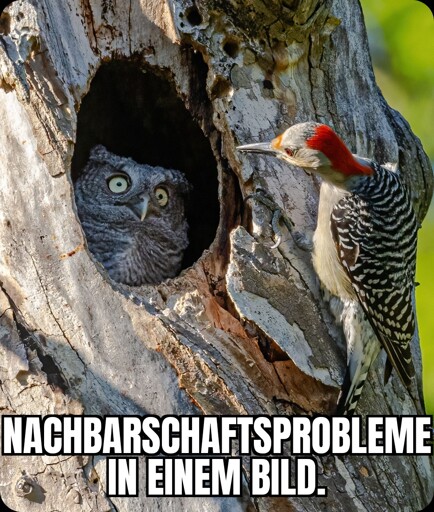 Käuze brüten gerne in Baumhöhlen. Spechte auch. Mit dem Unterschied, dass Spechte die Baumhöhlen selbst machen. Käuze können das nicht, weil sie keinen Presslufthammer im Gesicht haben. Die sind dann eher in der Hausbesetzerszene unterwegs.