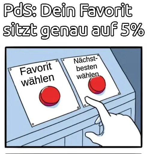 Definitiv deinen Favorit wählen, sonst landen wir irgendwann da, wo die USA sind und es gibt nur noch zwei Parteien, wenn alle nur das “nächstbeste” wählen.