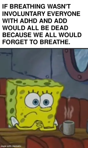 Dazharion@lemmy.dbzer0.com to ADHD memes@lemmy.dbzer0.comEnglish · 4 days agoI actually do have to remember to breathe sometimeslemmy.dbzer0.comimagemessage-square16fedilinkarrow-up1179arrow-down15