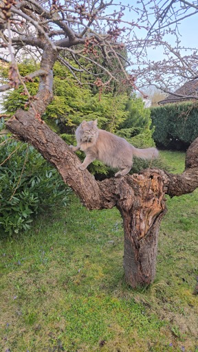 German: Miez hat endlich einen Baum gefunden, den sie sich traut hoch zu klettern