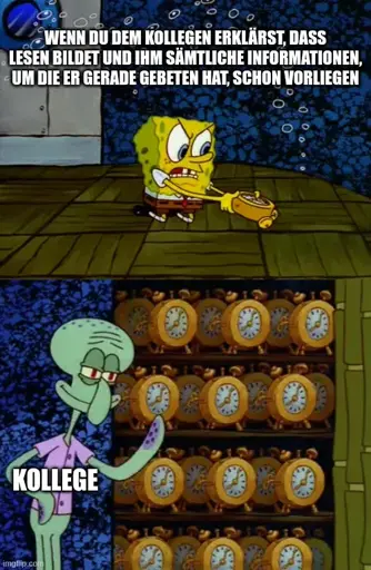 In der Szene will Spongebob aus Gründen, die ich vergessen habe, Thaddäus’ Wecker kaputt machen. Nachdem er das macht, stellt Thaddäus einen neuen Wecker auf. Spongebob zerschlägt auch den. Thaddäus stellt einen neuen Wecker auf. Auch den zerschlägt Spongebob. Dann offenbart Thaddäus, dass er einen ganzen Schrank mit den Dingern hat.