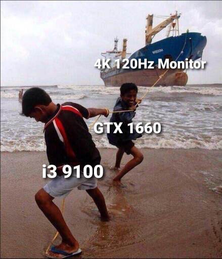 Is real 4k120hz monitor really that hard to drive by Gtx 1660 and 9th gen i3? This 2 components are still powerful hardwares, I have a laptop with 4th gen Ryzen5 and Gtx 1660ti and it can drive 4k144hz it just fine using DSR, if you are only using it for yt or normal desktop usage it’s pretty overpowered but for games it can run at 1080p and some 1440p just fine at respectable settings unless it’s Unreal5 shit then I can’t argue with that