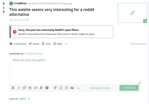 arrow-up11arrow-down1imageMy post about Lemmy in reddit got filtered as spamplus-squarelemmy.mlchismoso@lemmy.ml to Linux@lemmy.ml · 6 years agomessage-square0fedilink